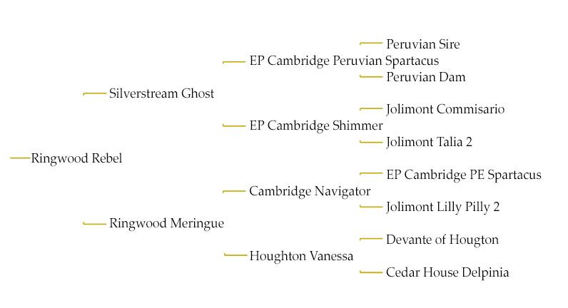 Zijn moeder "Ringwood Meringue" is een rechtstreekse dochter van de onverslagen Supreme Champion 2009/2010 "Cambridge Navigator. (Welke geen introductie meer nodig heeft.)