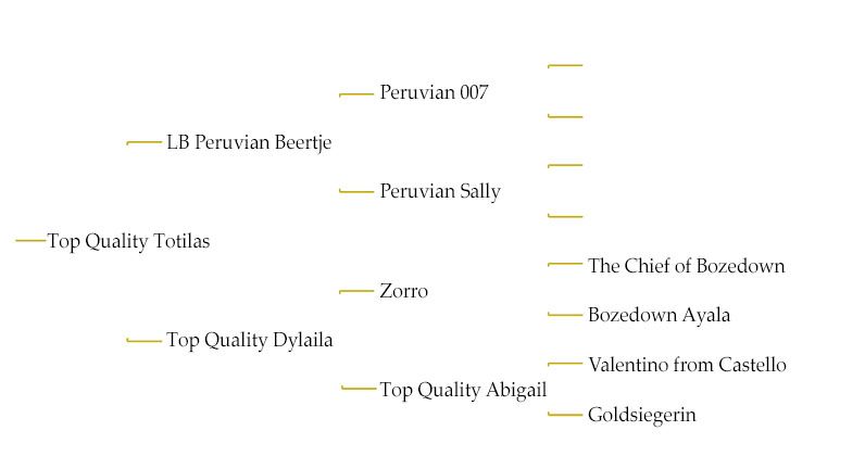 Zijn moeder Top Quality Dylaila is één van onze zwarte top merrie's. Zij bezit dan ook het complete pakket. (Iets wat zeer schaars is bij zwarte dieren.) Dit alles heeft ze o.a. te danken aan haar geweldige ouders. Haar vader is namelijk de zwarte kampioenshengst "Zorro". Hij is een rechtstreekse zoon van de legendarische hengst "The Chief", welke destijds geïmporteerd is door Bozedown Alpacas. Dylaila haar moeder was een merrie welke tot de absolute Top v.d. Benelux behoorde. Elk veulen wat zij ons gegeven heeft is absolute Top kwaliteit (ongeacht de hengst).